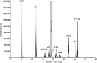 Full-scale and enlarged overlaid SRM chromatograms of three transitions for ten estrogenic steroid hormones for the impurity quantification of a βE2 material