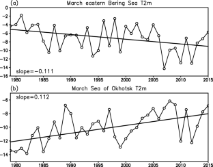 Chen, Z., Wu, R. Formation of contrasting March surface air temperature trends in the eastern Bering Sea and the Sea of Okhotsk during 1979–2015. Theor Appl Climatol 137, 1467–1477 (2019). https://doi.org/10.1007/s00704-018-2685-0