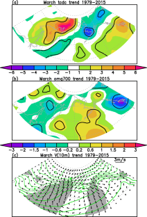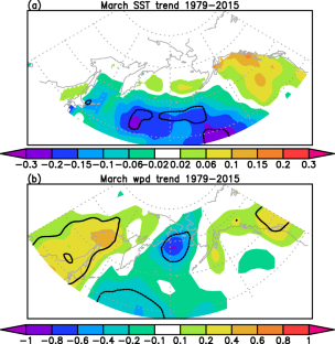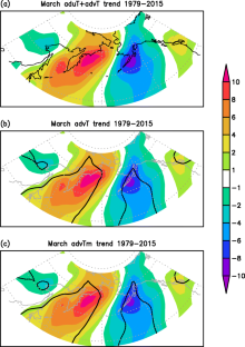 An opposite trend in surface air temperature is observed with centers over the eastern Bering Sea (decreasing trend) and the Sea of Okhotsk (increasing trend) during 1979–2015. The present study analyzes the reasons for the formation of the contrasting surface air temperature trends in the above two regions. Analysis shows that downward longwave radiation and anomalous meridional advection are two major terms for surface air temperature trends in the above regions. The surface turbulent heat flux trends are results of surface air temperature trends. The cooling trend over the eastern Bering Sea is related to the cloud cover decreasing trend and northerly wind trend. The former reduces downward longwave radiation, and the latter leads to anomalous cold advection. The warming trend over the Sea of Okhotsk is associated with the cloud cover increase that leads to downward longwave radiation increase and the southerly wind trend that induces anomalous warm advection. The cloud changes are related to anticyclonic wind changes over the northern North Pacific. The surface air temperature increasing trends appear to contribute to the sea ice decreasing trends in the Sea of Okhotsk. The present analysis suggests an important role of atmospheric circulation changes in the formation of opposite March surface air temperature trends over the eastern Bering Sea and the Sea of Okhotsk.