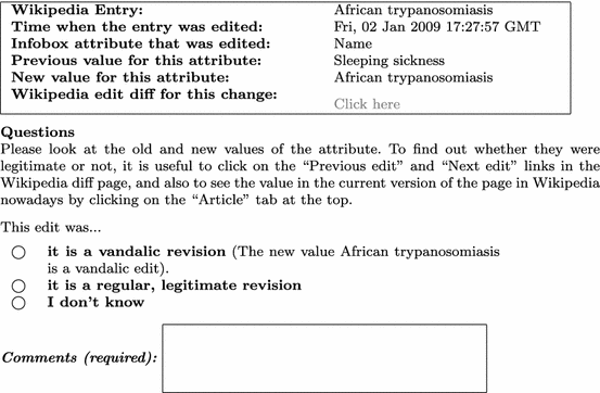 Wikipedia keeps logs of all the edits done by each contributor during the past many years. This allows us to explore the past changes for each entry. For example, this page shows a particular edit that was done to the entry āArticles of Confederation". In this example, the contributor modified the value of the attribute āwriter". This attribute is the one that is used in the infobox line specifying who the authors were. This particular contributor edited the value of the writer from just āContinental Congress" to a new value of an insulting nature. This is a clear case of vandalism. For the purposes of this evaluation, we consider that a contribution is vandalic if either: