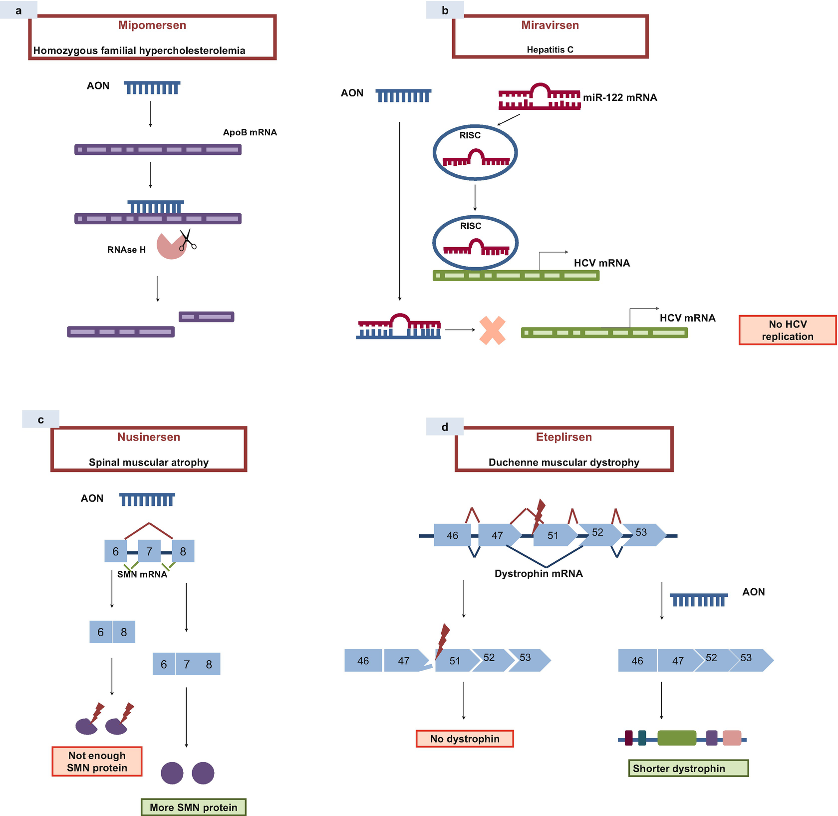 Antisense oligonucleotides Aptamers CRISPR-Cas gene editing Modified mRNA replacement therapy siRNA-based drugs U1snRNA vectorsAbbreviations