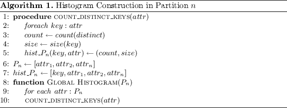 Algorithm 1 governs how each partition histogram \((hist\_P_n)\) should be built. Briefly, each attribute (attr) is traversed and for each key, the total number of distinct occurrences of that key is computed, together with its size. The pair of values is then added to the histogram. The tables in Fig. 2(a), (b) and (c) present the resulting histograms for each partition according to Fig. 1.