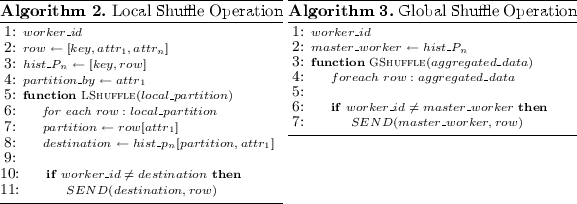 The Global Shuffle will forward all aggregated rows to the worker that will hold the overall largest data volume, which will from now on designate as master worker. By instructing the workers that hold the least volume of data, we are promoting the minimal usage of bandwidth possible. Algorithm 3 reflects the behavior for the Global Shuffle operator. The input data considered by the Global Shuffler is composed by the ordered and aggregated rows, both produced by earlier stages of the worker work flow. Such rows will now have to be reconciled by a common node, which for this case will be dictated by the master node, as previously stated. Upon start, the Global Shuffle operator will interrogate the histogram regarding the identity of the master node. Afterwards, as each aggregated row is handled by the operator, it is forwarded to the master worker, if the master node is not the current one.