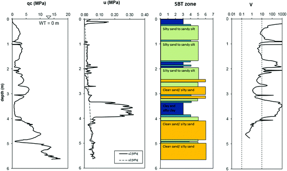 For the CPTU tests, a standard cone was used with a cone area of 10 cm2, a penetrometer diameter of 3.57 cm and a cone area ratio (a) of 0.58. The tests were performed at the standard rate of 2 cm/s.