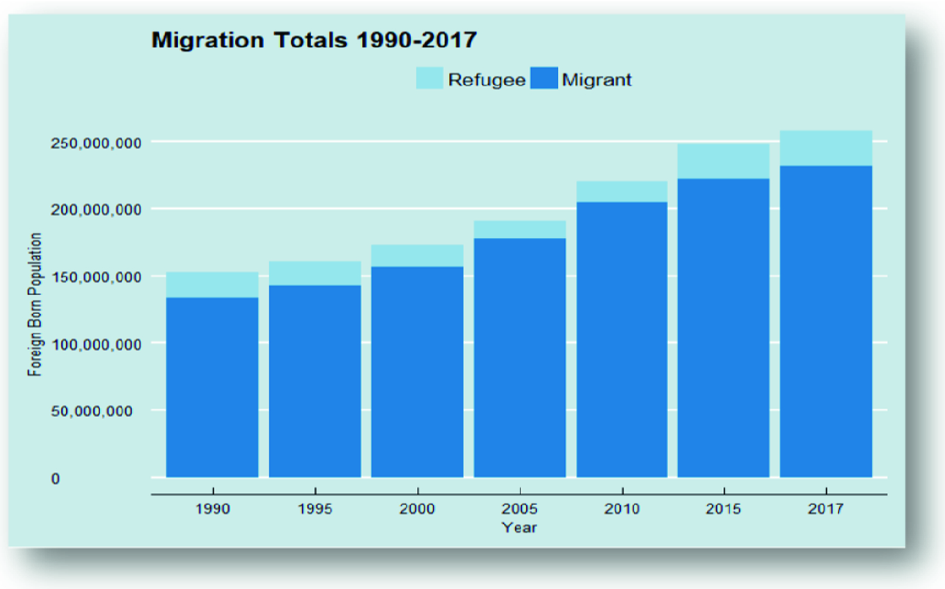 While for foreign-born populations, there is readily available data, studies challenge this operationalisation of migration, as it fails to capture when people moved and from where. Abel and Sander (2014), for instance, estimate the volume of migration flows and direction since 1990, finding that while the stock of foreign-born populations globally has increased, there has not been a drastic increase in the flow of migrants in recent years, relative to the global population size or in absolute quantities. These differences in measurement paint very different pictures regarding contemporary global migration, with popular narratives often following UN data, shown in Fig. 10.3, indicating massive increases in migrants.